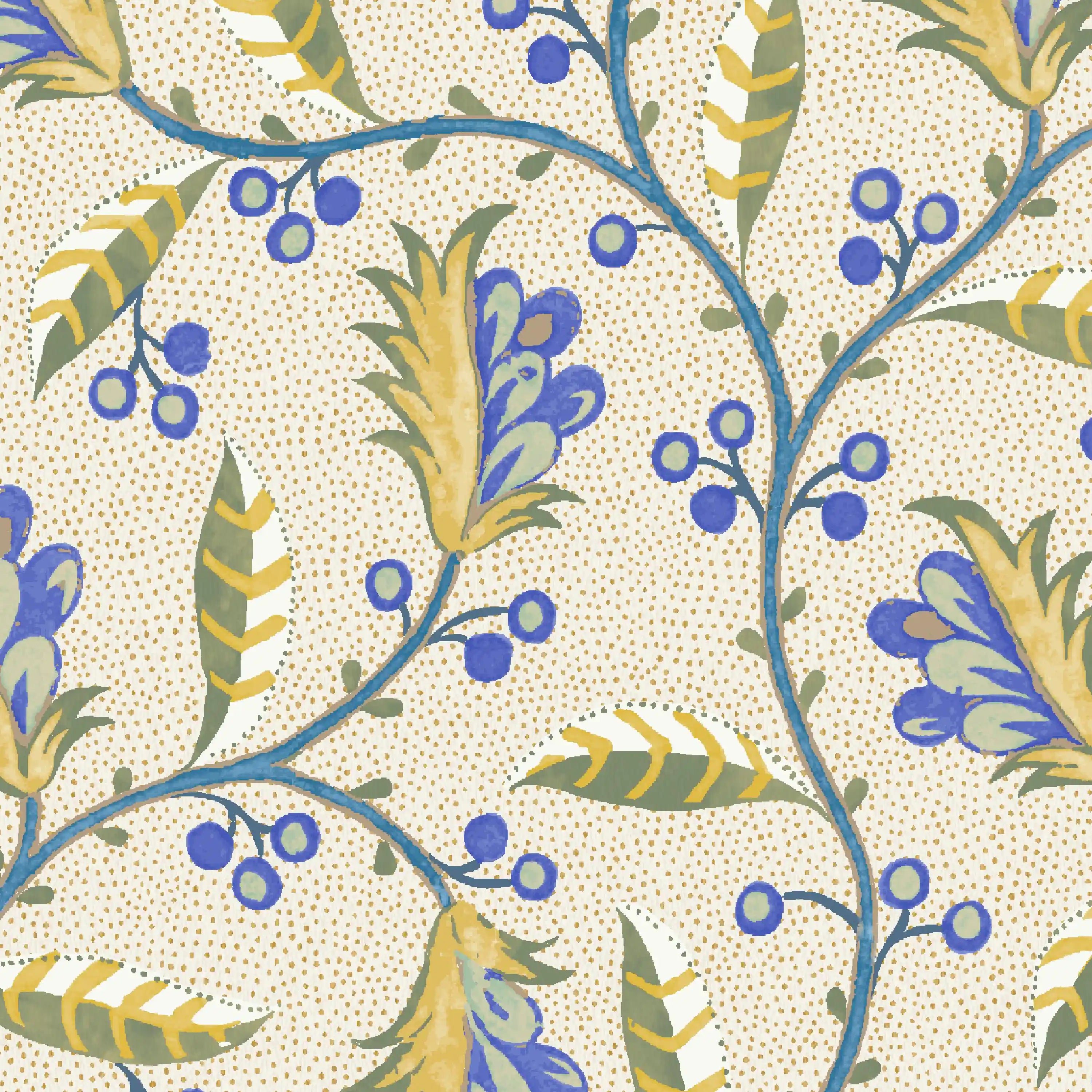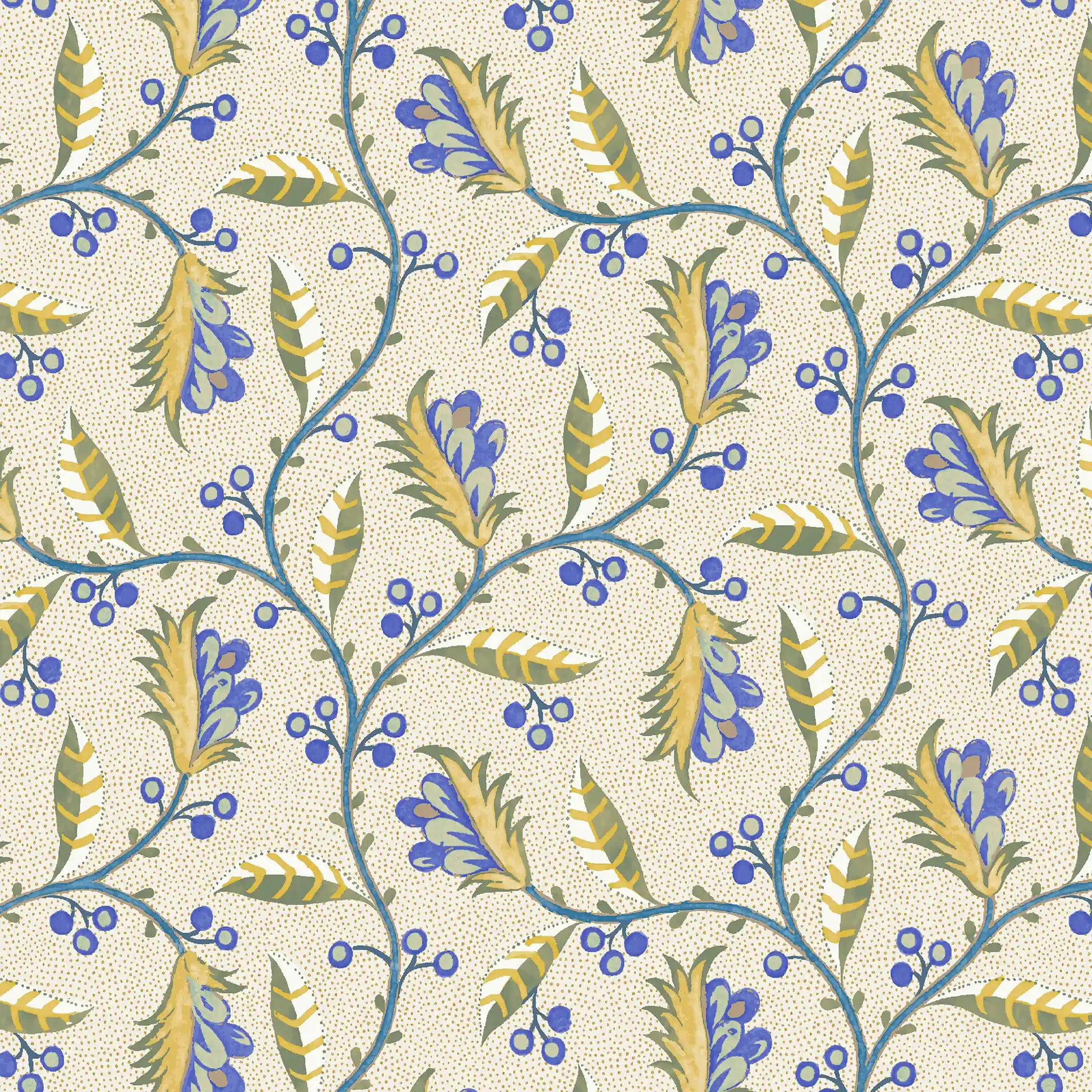 This design has a lovely French quality to it – hence the name! A classical pattern with punchy colours, it reminds us of our grandmother’s drawing room whose walls our mother painstakingly upholstered one hot summer. We love the spirited blossoms intertwined with looping leaves. Once you get your eye in, it takes you on a meandering journey…