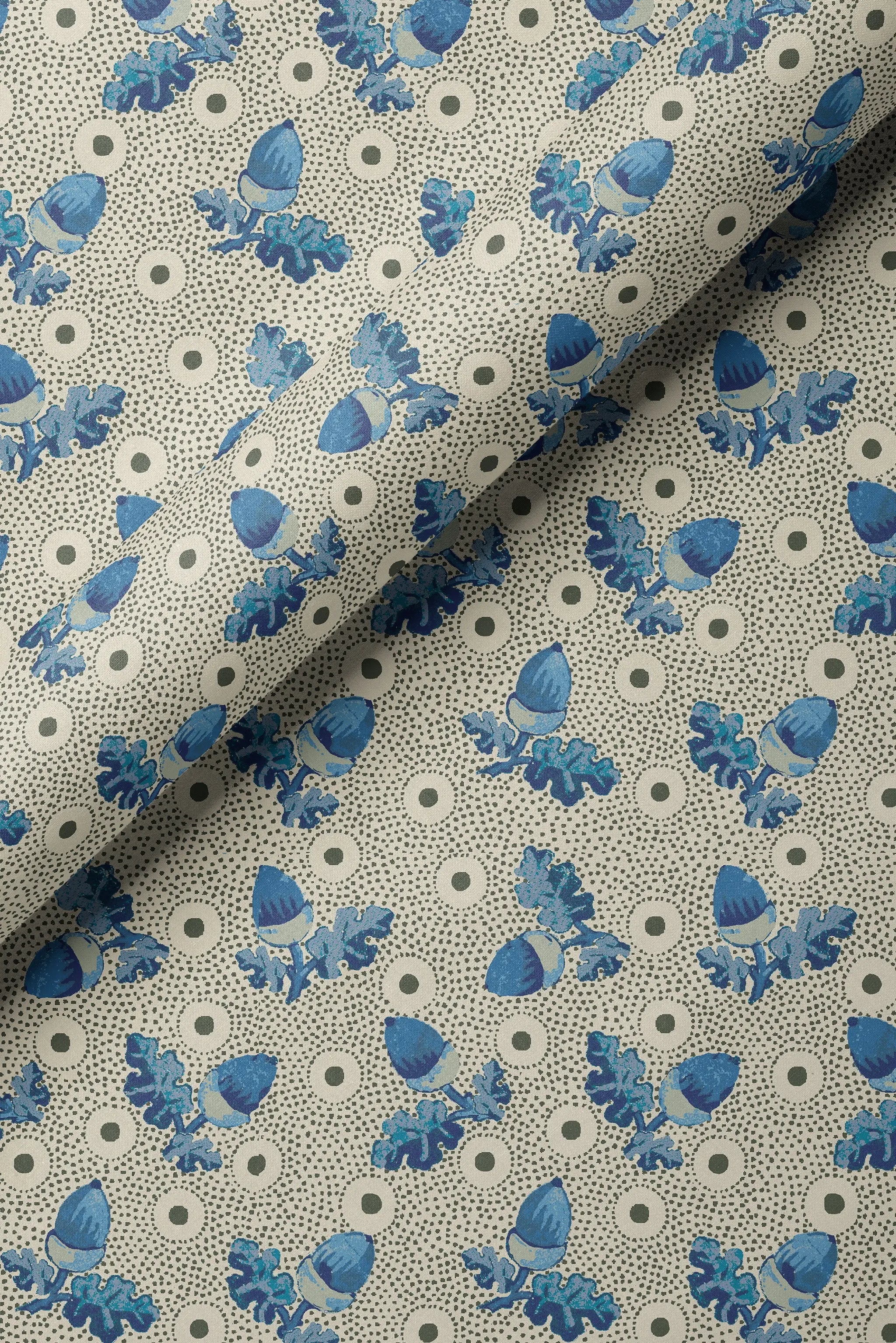 Sprightly acorns and gentle leaves scatter across this dotted landscape alive with movement and texture. With Elf, we wanted to create a graphic interpretation of a traditional acorn print. We love the way the sprigs pop whilst the grainy background adds subtlety.