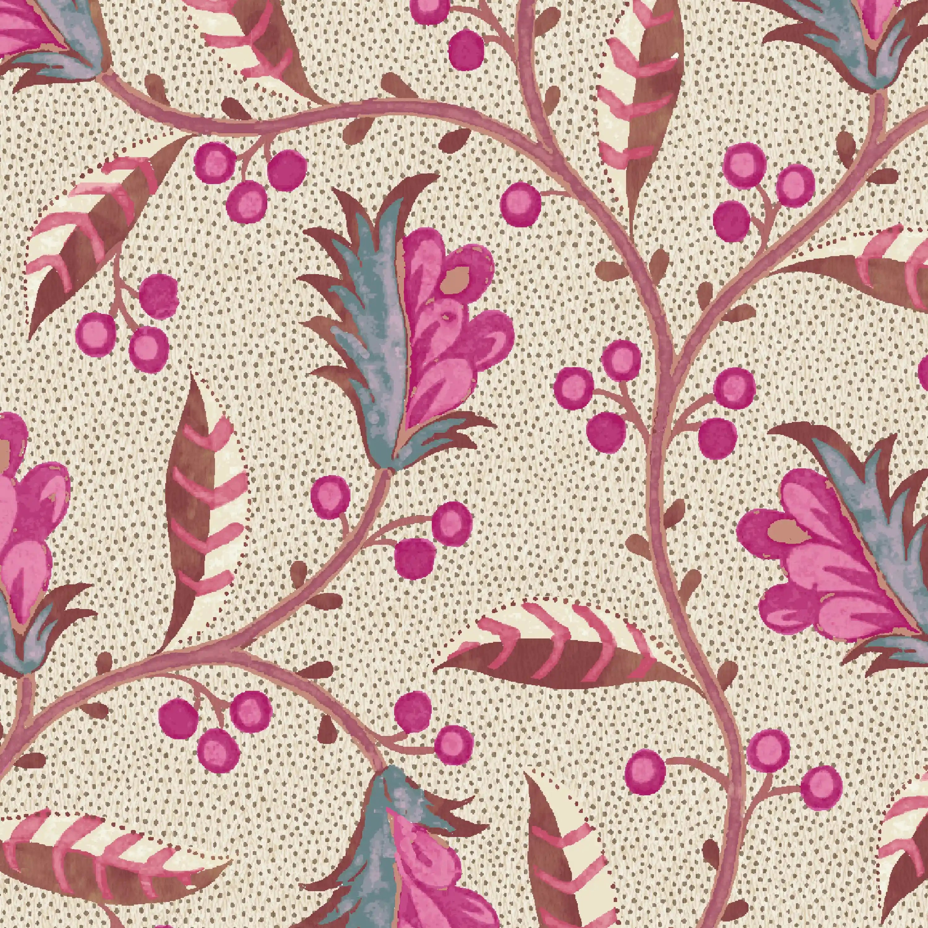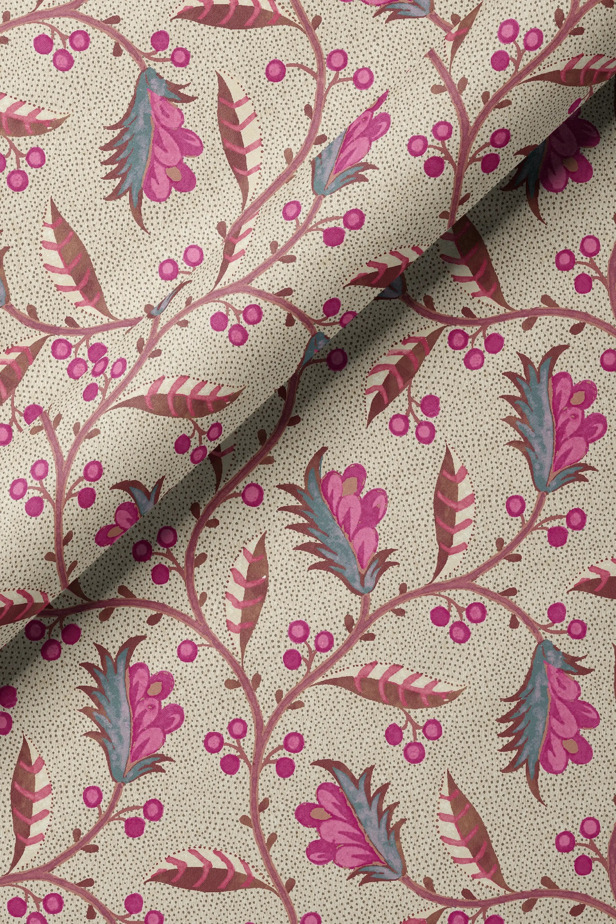 This design has a lovely French quality to it – hence the name! A classical pattern with punchy colours, it reminds us of our grandmother’s drawing room whose walls our mother painstakingly upholstered one hot summer. We love the spirited blossoms intertwined with looping leaves. Once you get your eye in, it takes you on a meandering journey…
